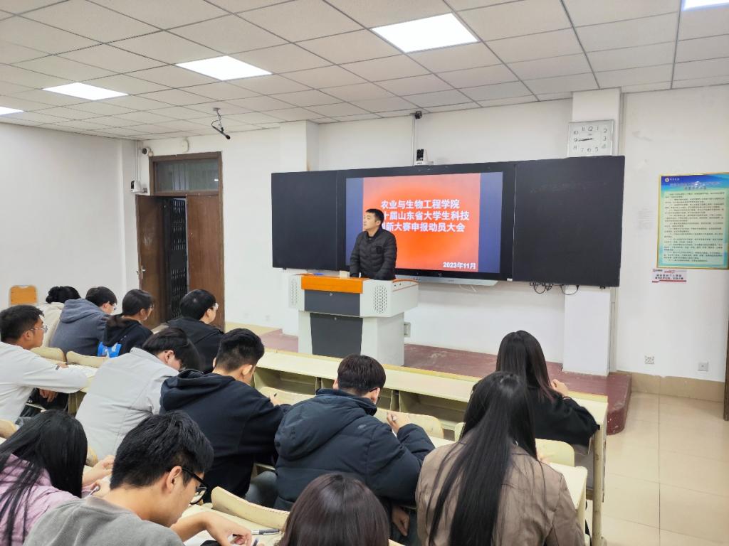 为深化高等学校创新创业教育改革的决策部署,鼓励支持大学生开展科技创新活动。农业与生物工程学院积极动员学生参加第十届山东省大学生科技创新大赛,以进一步提高农业与生物工程学院学生参赛热情和加强参赛项目的大赛竞争力,11月19号,农业与生物工程学院在9212教室开展参赛动员大会,会议由辅导员谭政老师主持,农业与生物工程学院学生联合会全体成员及各班学生代表参加。