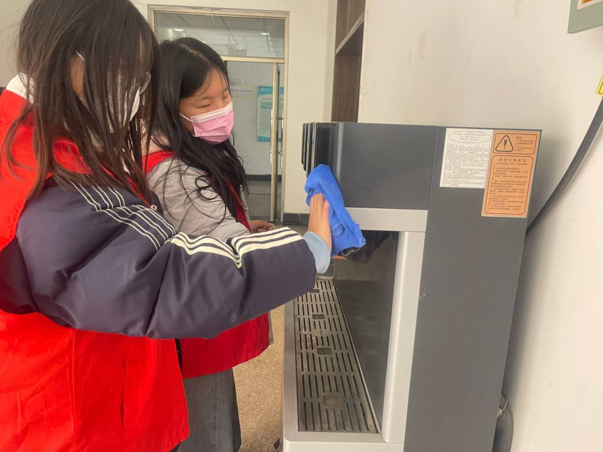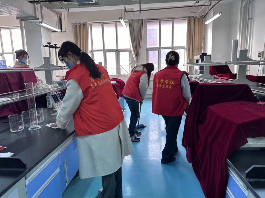 活动过程中,同学们展现了对活动的极大热情。在团支书的组织下同学们领取志愿服,将生物科学班,农检一、二班,园艺一、二班和药品生物技术一班的同学分为四队。每队都在各班负责人的带领下划分不同的区域,分别组织打扫饮水机、清理六号楼前花坛内的垃圾、擦桌子扫地以及打扫实验室等活动,在减轻相关工作人员工作量的同时为校园创造了一个良好的环境,也让爱护环境的种子在每一位志愿者的心中发芽。志愿活动结束后,同学们于六号楼门口集合,分享活动心得和体悟,大家均表示受益匪浅。