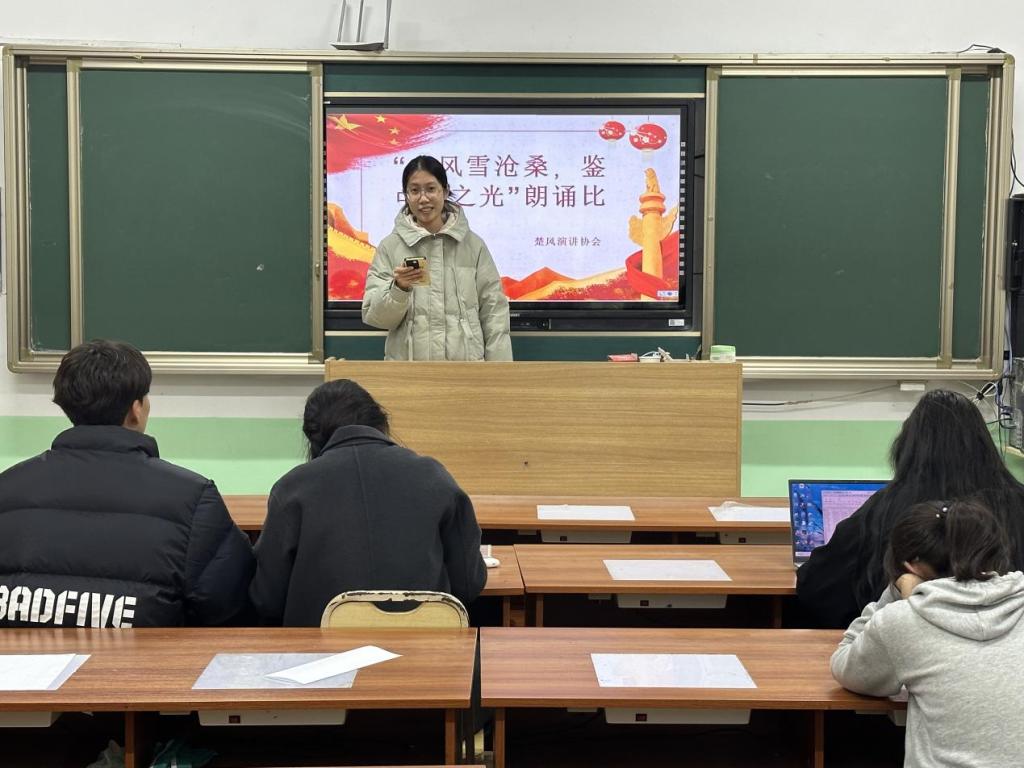 12月8日,教师教育学院楚风演讲协会在东校区教学楼105室举办“以风雪沧桑,鉴中华之光”主题朗诵活动,教师教育学院学子积极报名,踊跃参与。