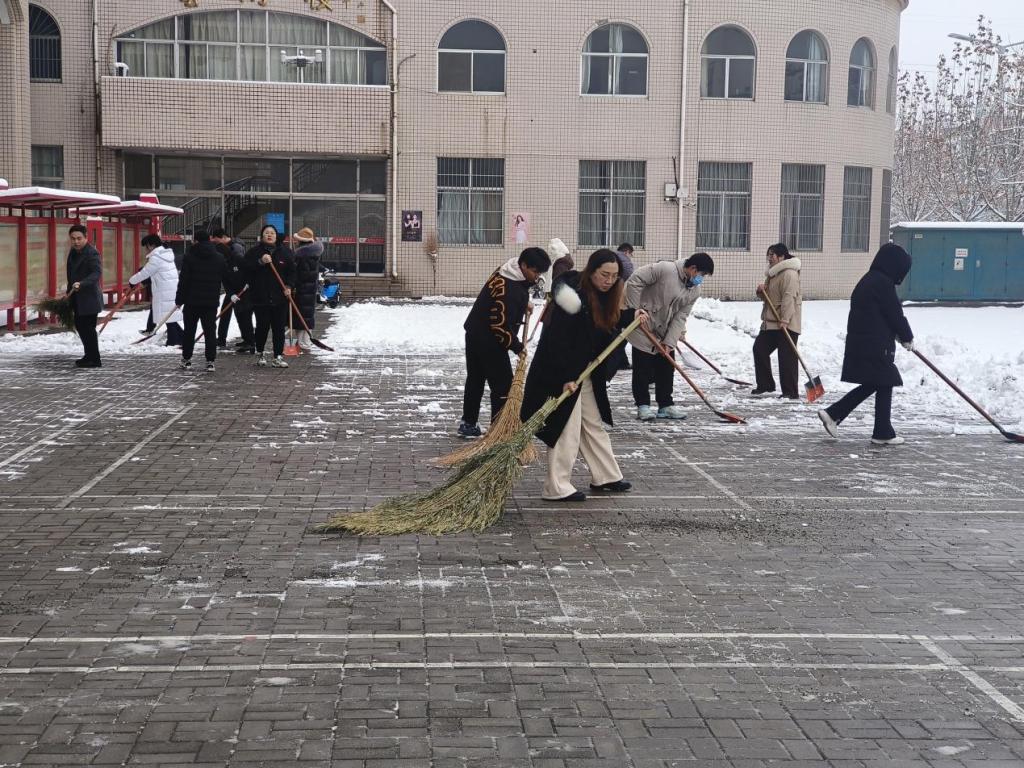 随着扫雪工具的发放,志愿者们迅速投入到工作中。他们拿着铁锹、扫帚等工具,按照小组划分的负责区域,有条不紊地将道路和广场等地方的积雪一一清除。老师和同学们分工明确,默契配合,干劲十足,以饱满的热情和昂扬的精神风貌积极投身扫雪行动中,在大家的共同努力下,道路变得更加畅通,同学们的出行也变得更加方便。