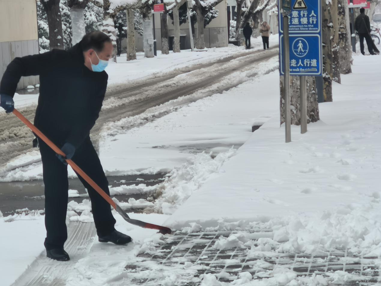 1月16日,教师教育学院在校园内开展扫雪志愿服务活动。教师教育学院党委书记姜保周,党委副书记李婷、副院长韩丕国带领同学们积极参与志愿服务活动。