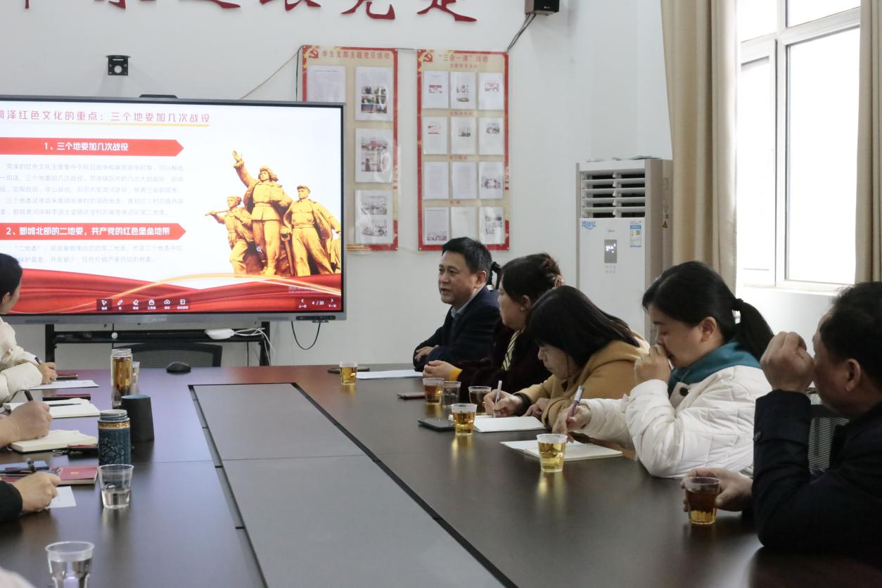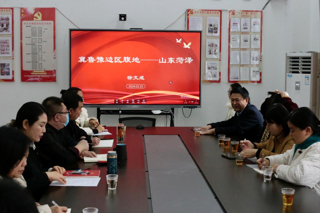 为进一步利用好身边红色资源,传播红色文化,传承红色基因,汲取奋进力量,用“艺术”讲好红色故事,2月23日下午,音乐与舞蹈学院教工党支部与学生第一、第二党支部开展支部共建活动,以“红色文化进校园”主题党日为契机,邀请了山东省黄河促进会理事、菏泽红色文化传承人—徐文成,为支部师生党员带来了一场生动的“菏泽红色文化”讲座。