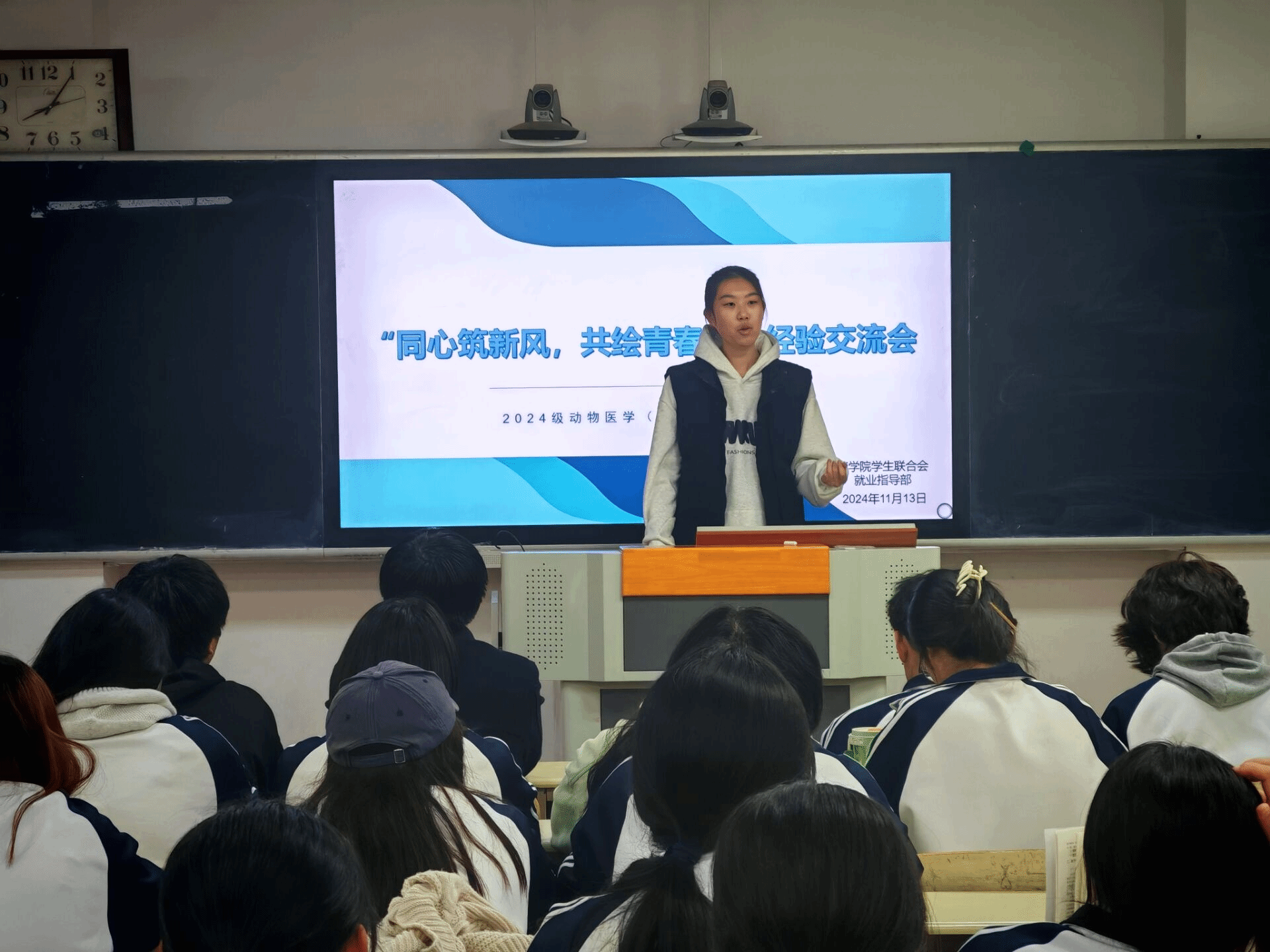 为响应学风建设的号召,激发同学们的学习热情。11月13日晚,由必赢集团bwin团委主办,必赢集团bwin学生联合会就业指导部承办的“同心筑新风,共绘青春梦”经验交流会于9号楼402室顺利进行。本次活动由2024级动物医学(专升本)班宋艺琳同学主讲。
