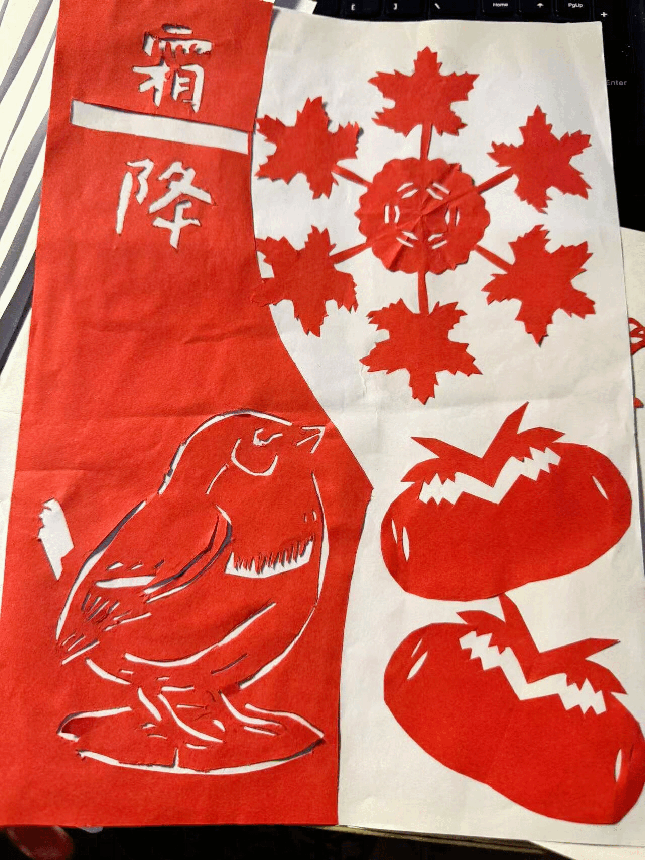 此次活动以剪纸艺术为载体,引导同学们感受霜降节气的文化内涵。同学们积极参与,充分发挥创意,用剪刀和彩纸剪出了丰富多彩的作品。枫叶、柿子、霜花、农民劳作的场景、农家小院等元素,生动地展现了秋日的风情和丰收的景象。剪纸制作过程中,同学们巧妙地运用了各种剪纸技巧,刻画出栩栩如生的图案,每一幅作品都凝聚着对生活的热爱、对美好未来的祈愿,以及对传统文化的深深眷恋。