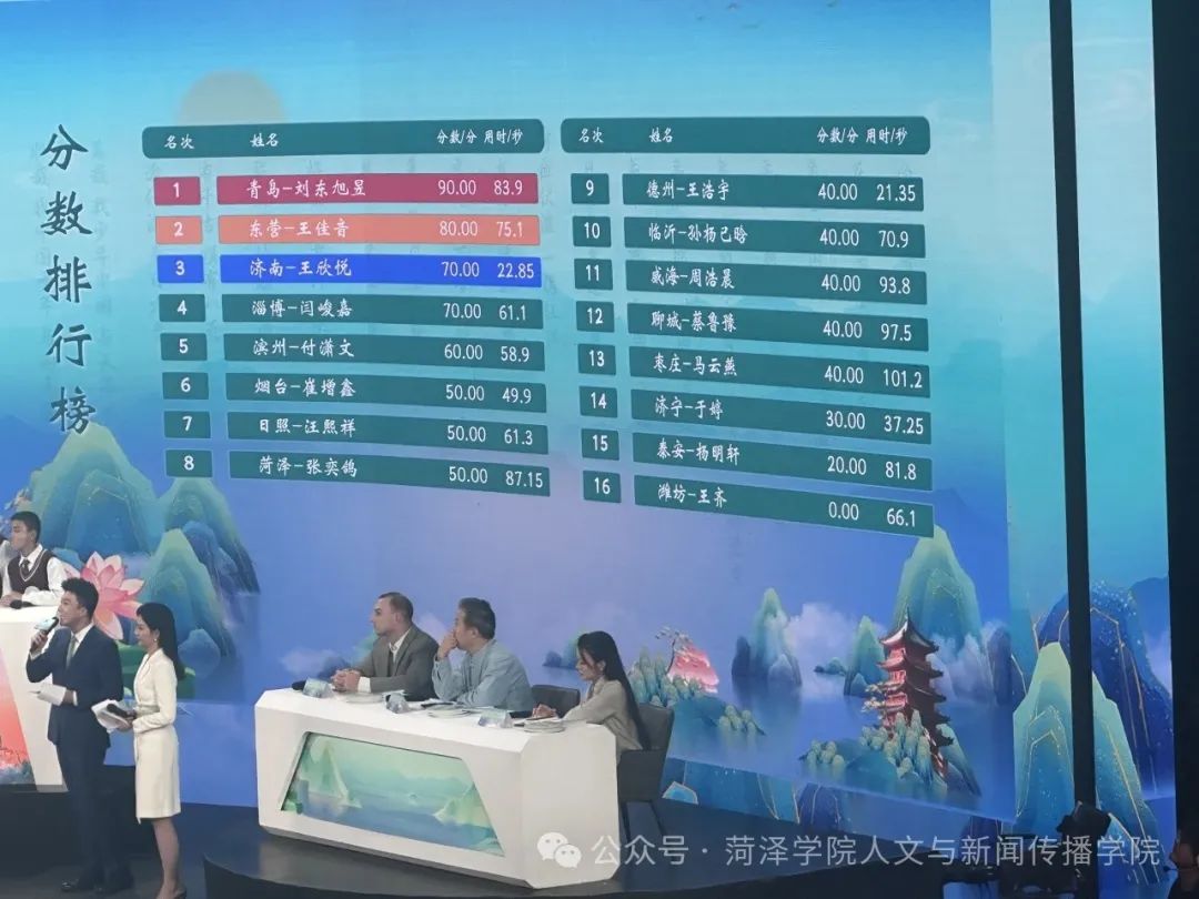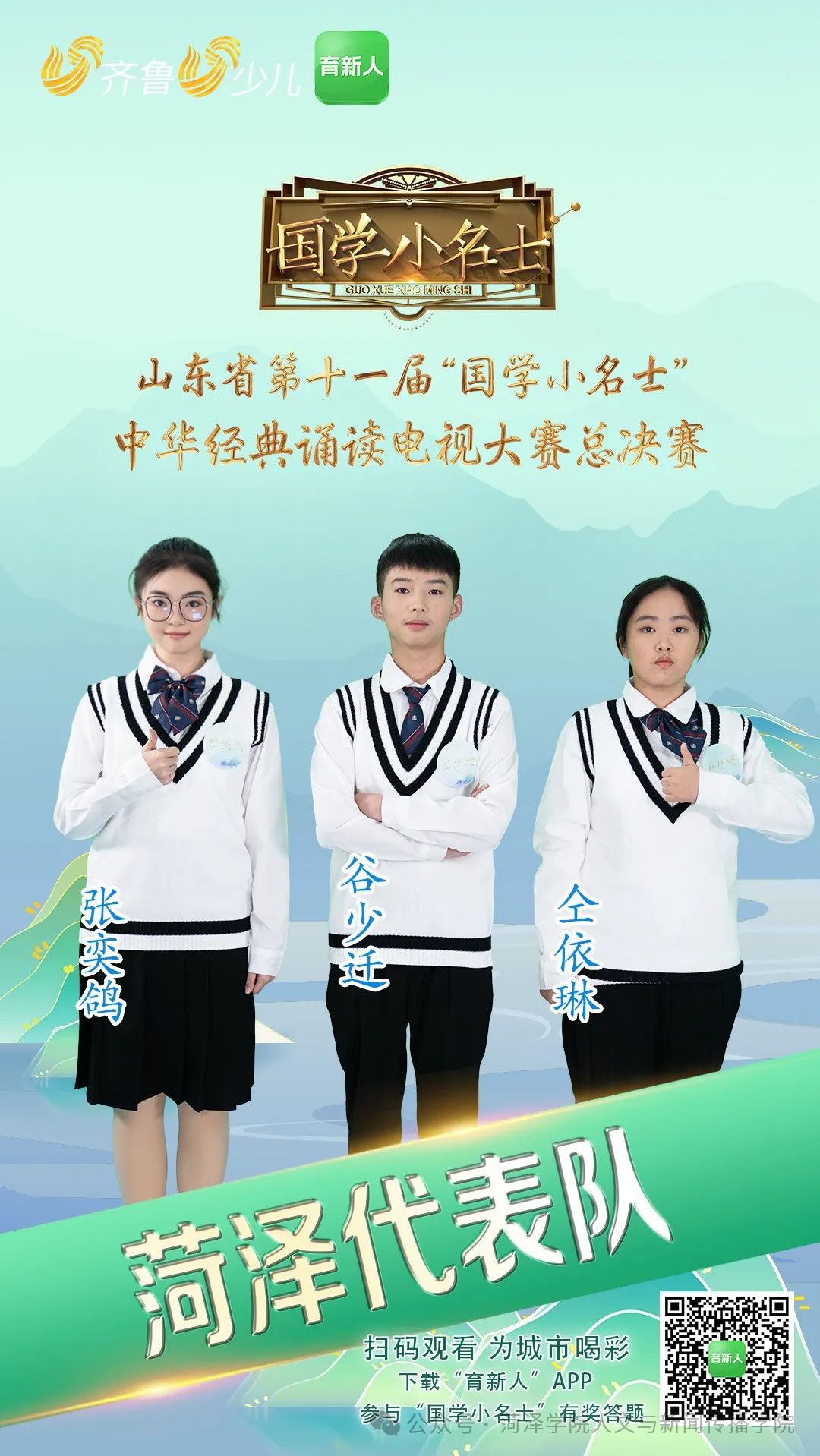 11月30日,由山东省文明办、山东省关工委、共青团山东省委、山东省妇联、山东省教育厅、山东广播电视台主办的山东省第十一届“国学小名士”中华经典诵读电视大赛总决赛在山东广播电视台成功举行。必赢集团bwin人文与新闻传播学院2023级学生张奕鸽与另两名中小学学生组成的菏泽市代表队,稳扎稳打,过关斩将,最终团队和个人均取得佳绩。