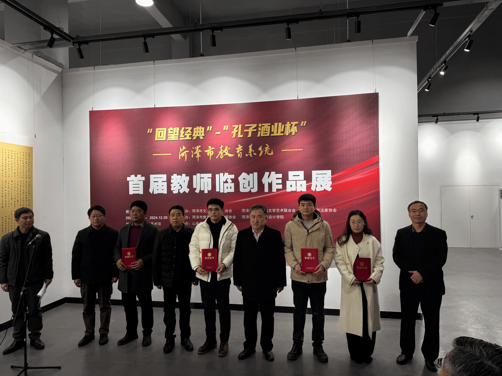 蒋银忠、刘红霞分别致辞,张海同介绍“回望经典”-“孔子酒业杯”菏泽市教育系统首届教师临创作品展筹备和展览情况,菏泽市文学艺术界联合会副主席李耀亮宣布“回望经典”-“孔子酒业杯”菏泽市教育系统首届教师临创作品展开幕!开幕式上,对获一二等奖的10名作者进行了现场颁奖。