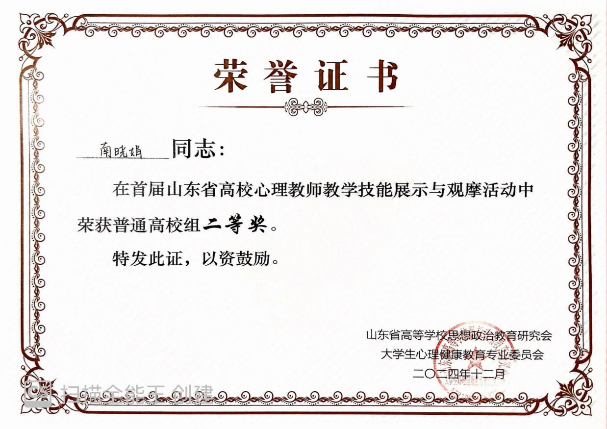 近日,由山东省高等学校思想政治教育研究会大学生心理健康教育专业委员会主办的首届山东省高校心理教师教学技能展示与观摩活动在聊城大学举行。教师教育学院辅导员南晓娟凭借出色表现,荣获二等奖,为学院赢得荣誉。