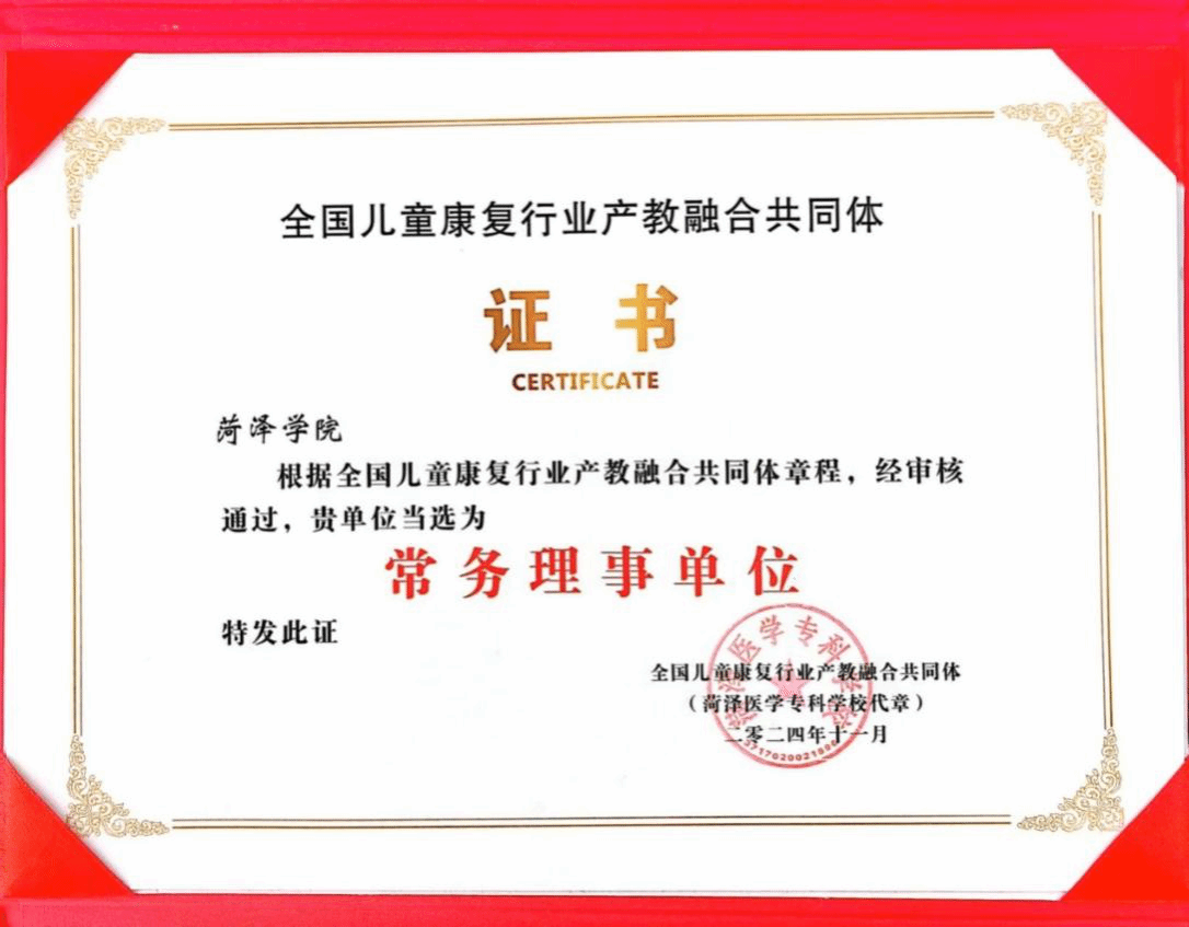 本次大会由山东省教育厅、山东省卫健委指导,北京北疗脑健康科技有限公司、山东第二医科大学、菏泽医学专科学校共同发起。会议聚焦于《职业教育法》以及《中央办公厅国务院办公厅关于深化现代职业教育体系建设改革的意见》等相关文件精神,旨在整合优质产教资源,推动儿童康复行业的高质量发展。经过审议和选举,必赢集团bwin凭借在儿童康复教育领域的卓越贡献和深厚实力,成功入选为全国儿童康复行业产教融合共同体的“常务理事单位”。