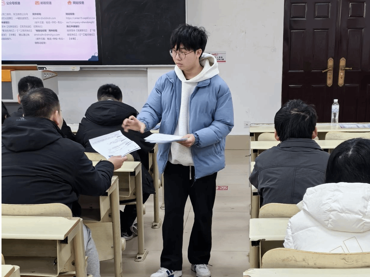 活动伊始,企业负责人通过宣传片和PPT向同学们全面展示了企业的文化理念、发展历程以及未来的发展方向。这不仅让同学们对企业的基本概况有了更为清晰的认识,还深刻感受到了企业的发展优势和潜力。随后,负责人详细介绍了企业与国家层面的合作创新成果,并表达了对具有创业精神和综合素质高的毕业生的期待。在互动环节,部分同学向企业负责人提问,涉及企业选人标准、薪资待遇等方面的问题。负责人针对同学们提出的问题进行了耐心的讲解。最后,同学们向负责人助理提交了各自的简历。