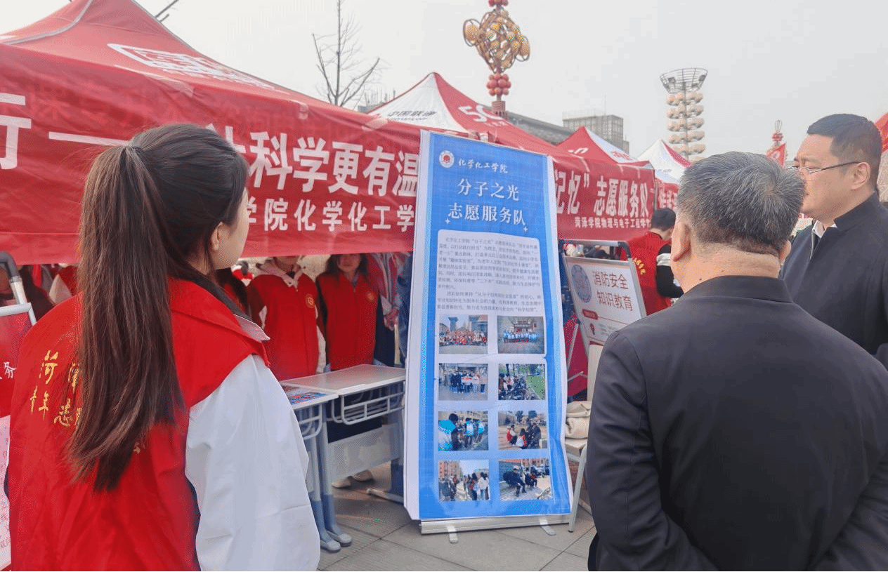 活动期间,党委书记黄富峰、校长孙建昌来到化学化工学院志愿服务活动介绍栏。在曹馨文同学的详细讲解下,两位领导了解了化学化工学院“分子之光”志愿服务队的主要项目与意义,并提出了宝贵建议和新思路。