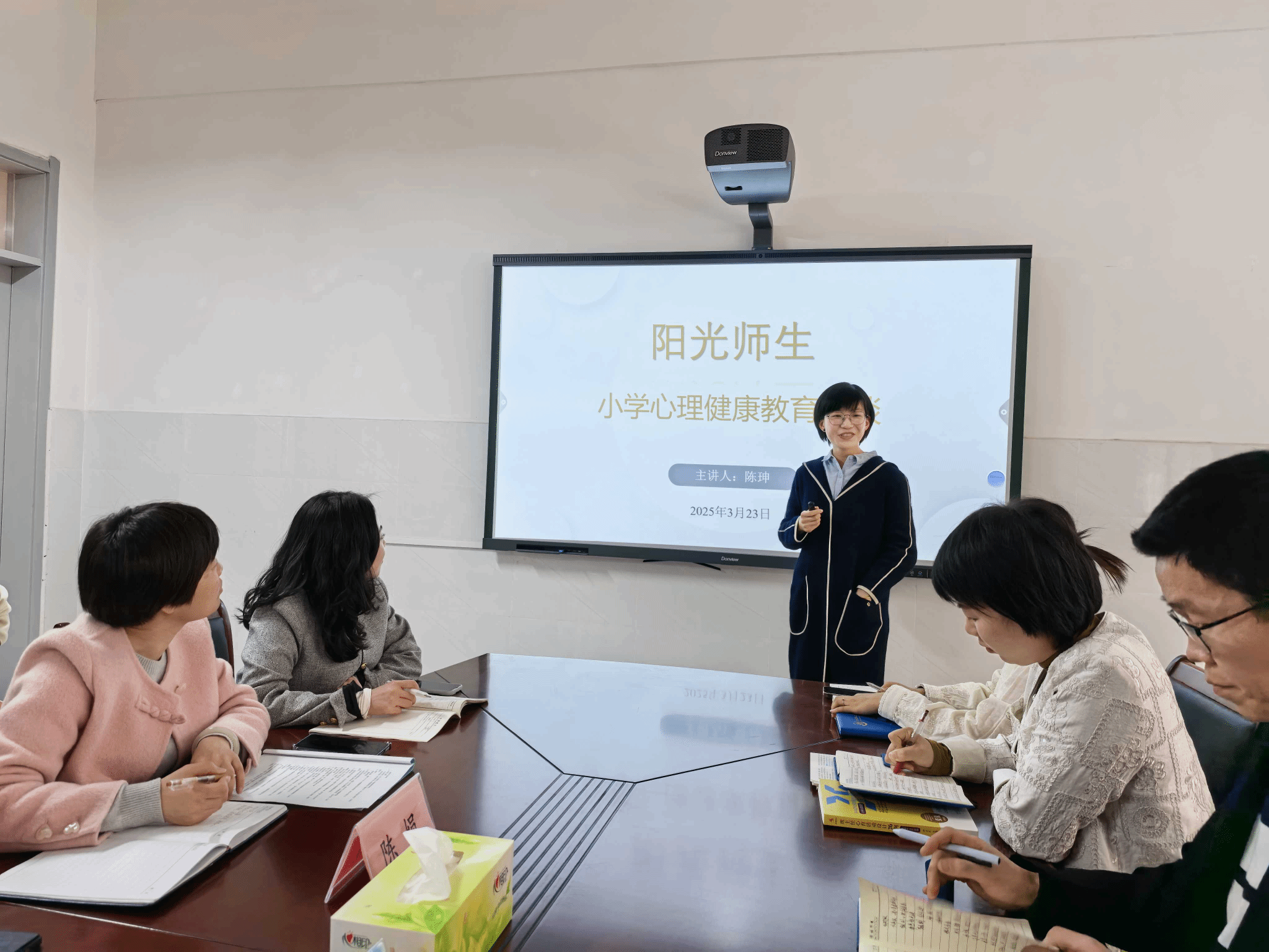 解放北路小学校长聂永昌、教务主任陈娟、心理健康教育教师许冬玲先后介绍了学校的心理健康教育教学开展情况,陈珅对其学校心理健康教育课程设计与心理健康教育教学计划给予高度评价,认为其贴合学生心理发展需求,具备前瞻性和实用性。在交流环节,陈主任强调教师心理健康的重要性。她指出,教师需先维护自身心理健康,才能更好地呵护学生心理健康。陈珅为教师们提供了实用的心理调适方法,鼓励他们学会自我关爱,保持良好的心理状态。