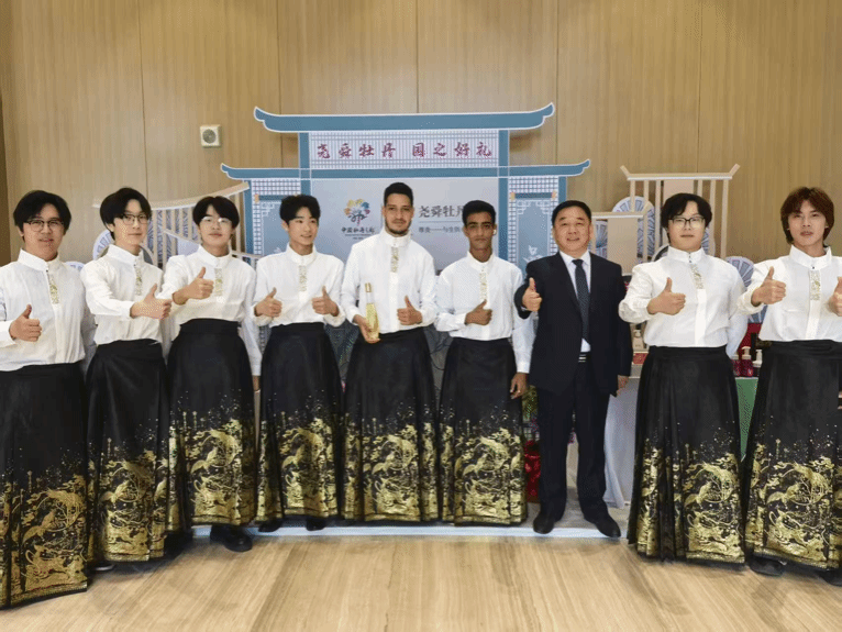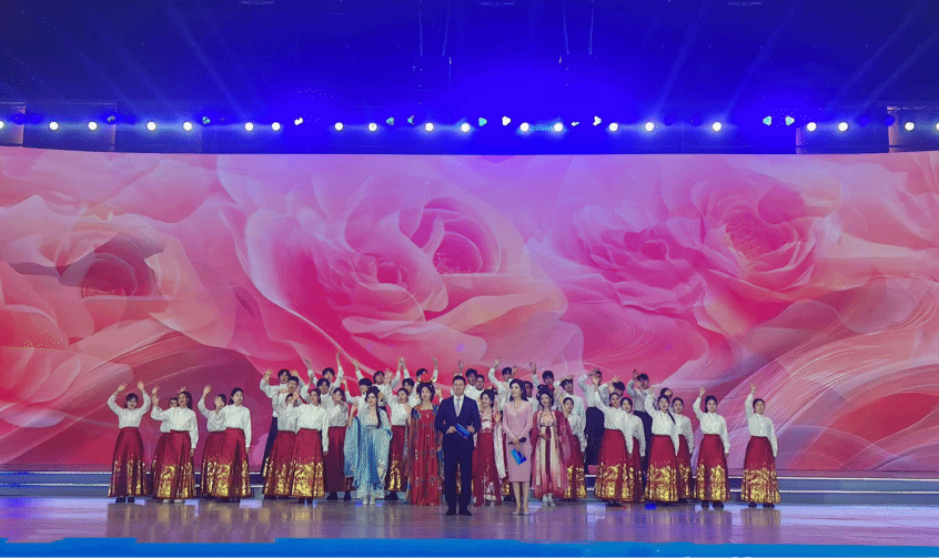 演出现场,表演者们身穿白色上衣和红金相间马面裙,色彩斑斓,宛如一幅世界文化融合的画卷。当熟悉的旋律响起,歌声在会盟台会议中心回荡。这歌声,饱含着团结与友爱,传递着和平与希望,使现场的每一位观众都深陷其中。