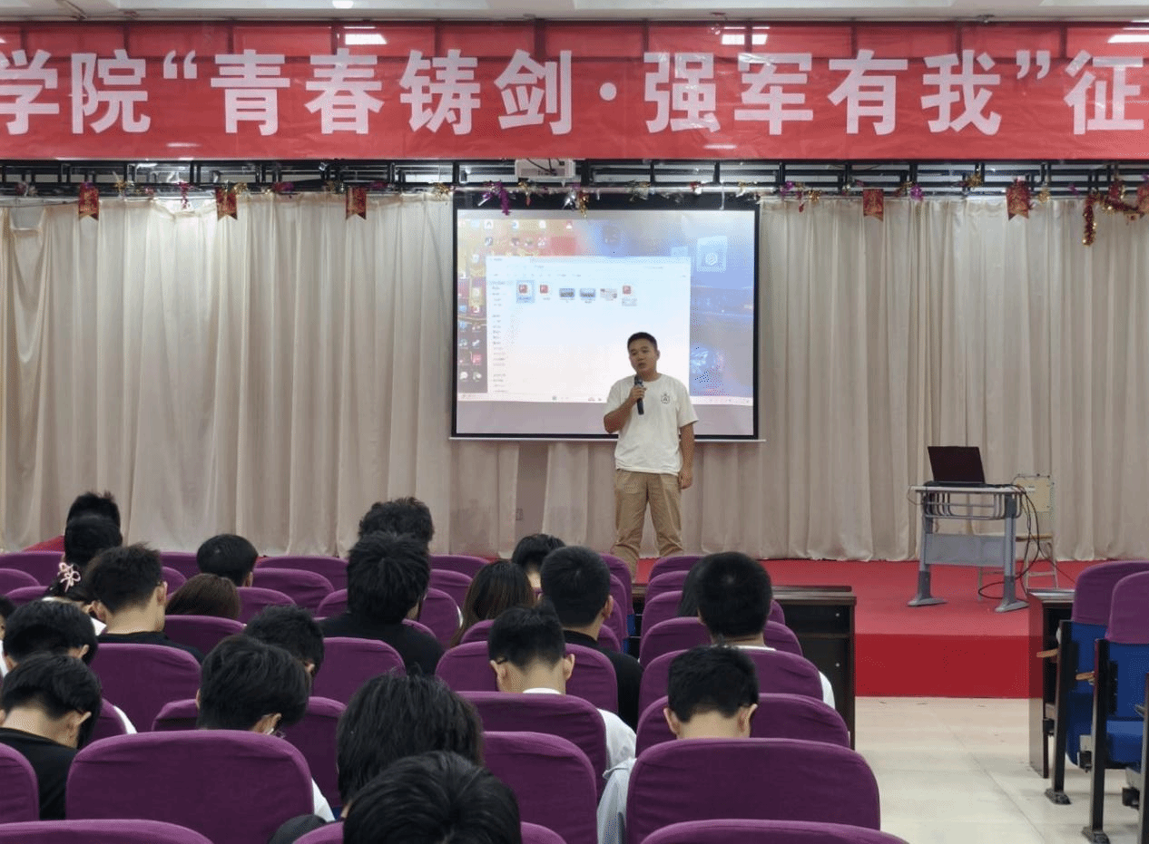 随后,四位退役学生代表结合他们个人军营经历,向大家分享部队训练的艰苦磨砺和战友间的深厚情谊,以及退役后复学的心路历程。他们表示,“如果青春的底色是生机勃勃的浅绿色,那军旅的深绿色无疑赋予了生命更加庄严肃穆的含义,青春应当在奋斗中书写。”一个个鲜活的军旅故事,如同火种,点燃了在场同学心中参军报国的炽热情怀,让投身绿色军营、建功国防事业的信念在同学们心中生根发芽。