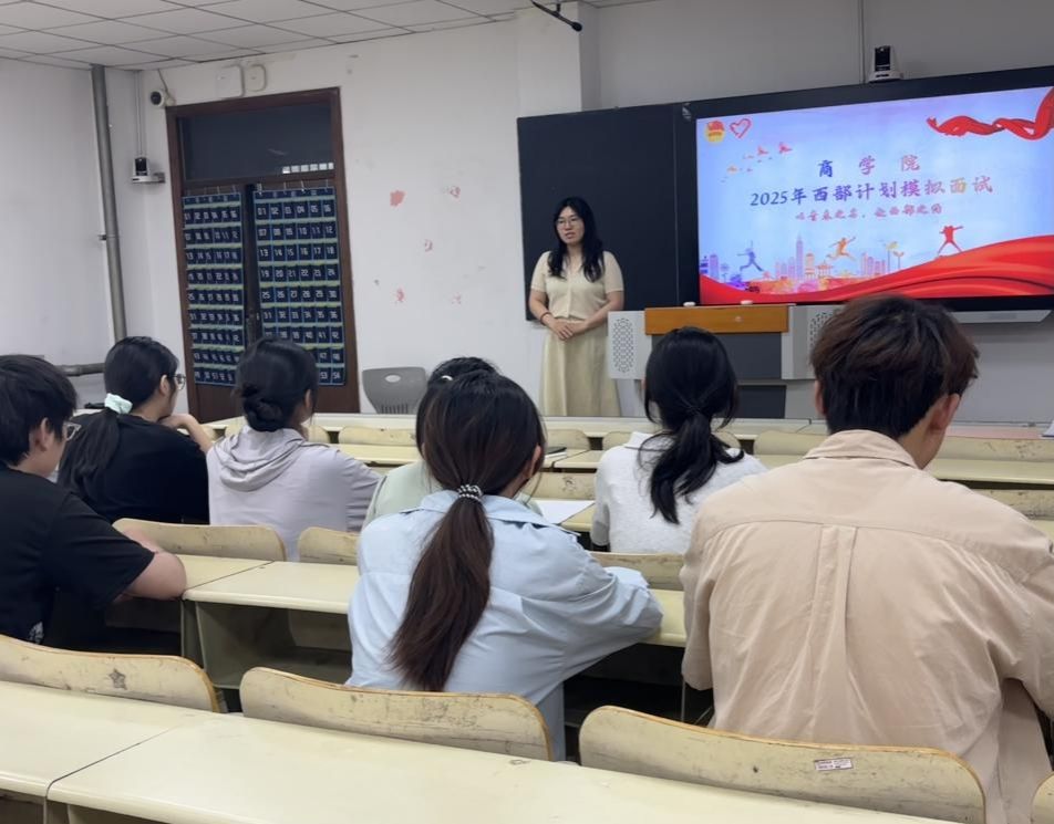 为积极响应国家“到西部去,到基层去,到祖国需要的地方去”的号召,助力商学院学子精准把握西部计划政策导向,系统强化应试能力,扎实提升面试综合素养。5月16日,商学院团委特在8号楼204教室开展西部计划模拟面试活动,商学院学工办主任孙雪、辅导员张亚娟、朱树荫组成评审团,对参与同学进行了全面考核。