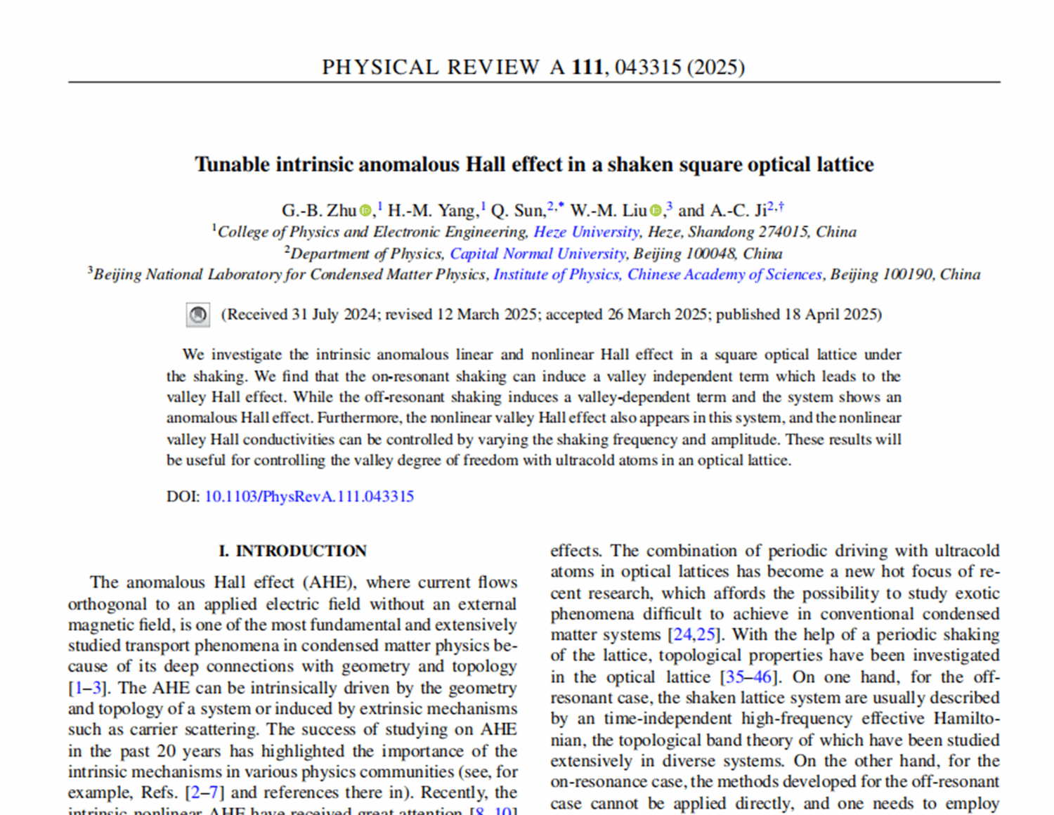 该论文研究了周期驱动下的方形光晶格,在量子态的调控方面取得了突破性进展,提出了实现反常霍尔和谷霍尔效应的方法,为相关领域的应用与发展提供了重要理论支撑。朱国宝博士长期从事材料的各种量子现象和输运性质的研究,主持完成国家自然科学基金2项,山东省自然科学基金1项。