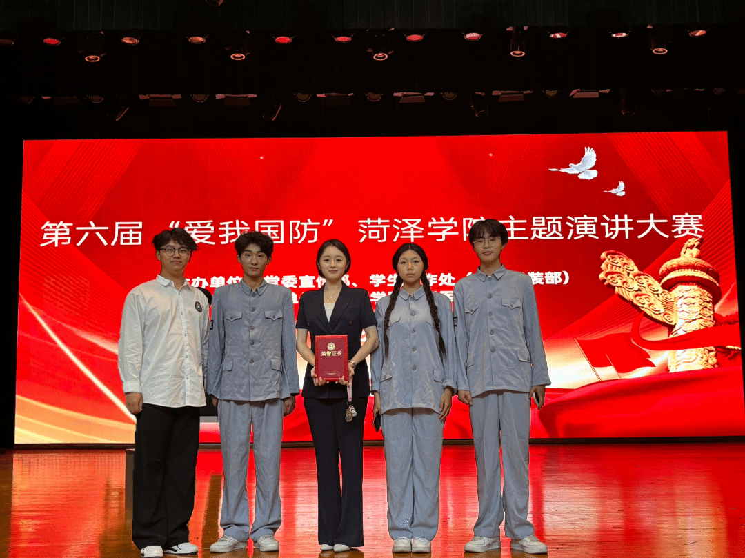 最后亮相的是孟璐、李雨桐、陈佳昊和李星宇四位同学,他们的演讲题目是《弦音烽火映初心,沂蒙薪火铸军魂》,四位同学各具特色的演讲,宛如四场震撼心灵的国防教育课。有的以细腻笔触勾勒戍边战士的坚守,令听众热泪盈眶;有的用铿锵话语解读科技强军的意义,展现非凡格局;有的以鲜活案例讲述军民鱼水深情,感染力十足。这份二等奖,不仅是对他们实力的认可,更是他们传递国防力量的勋章,期待他们未来绽放更耀眼的光芒。