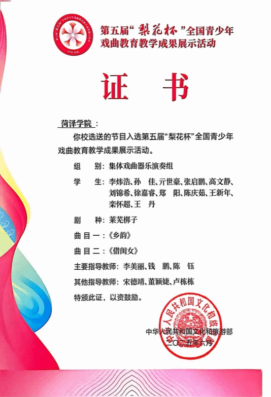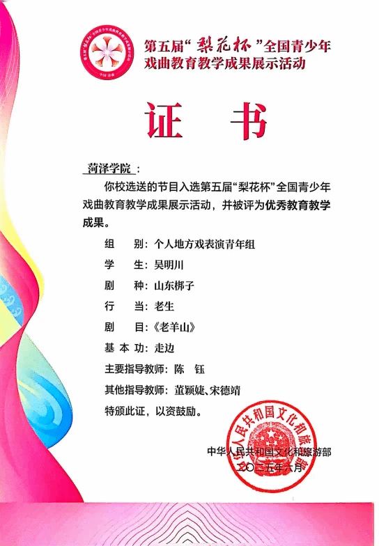 近日,由文化和旅游部主办的第五届“梨花杯”全国青少年戏曲教育教学成果展示活动优秀成果名单公布,音乐与舞蹈学院报送的剧目山东梆子《老羊山》经过层层筛选,在全国26个省区市83所院校推荐的282个节目中脱颖而出,最终入围23个优秀教育教学成果。加上之前音乐与舞蹈学院入选的莱芜梆子集体戏曲器乐演奏项目,本届“梨花杯”音乐与舞蹈学院实现了“双丰收”,在这场全国性赛事中展现了音乐与舞蹈学院在戏曲教育方面的深厚底蕴与创新活力。