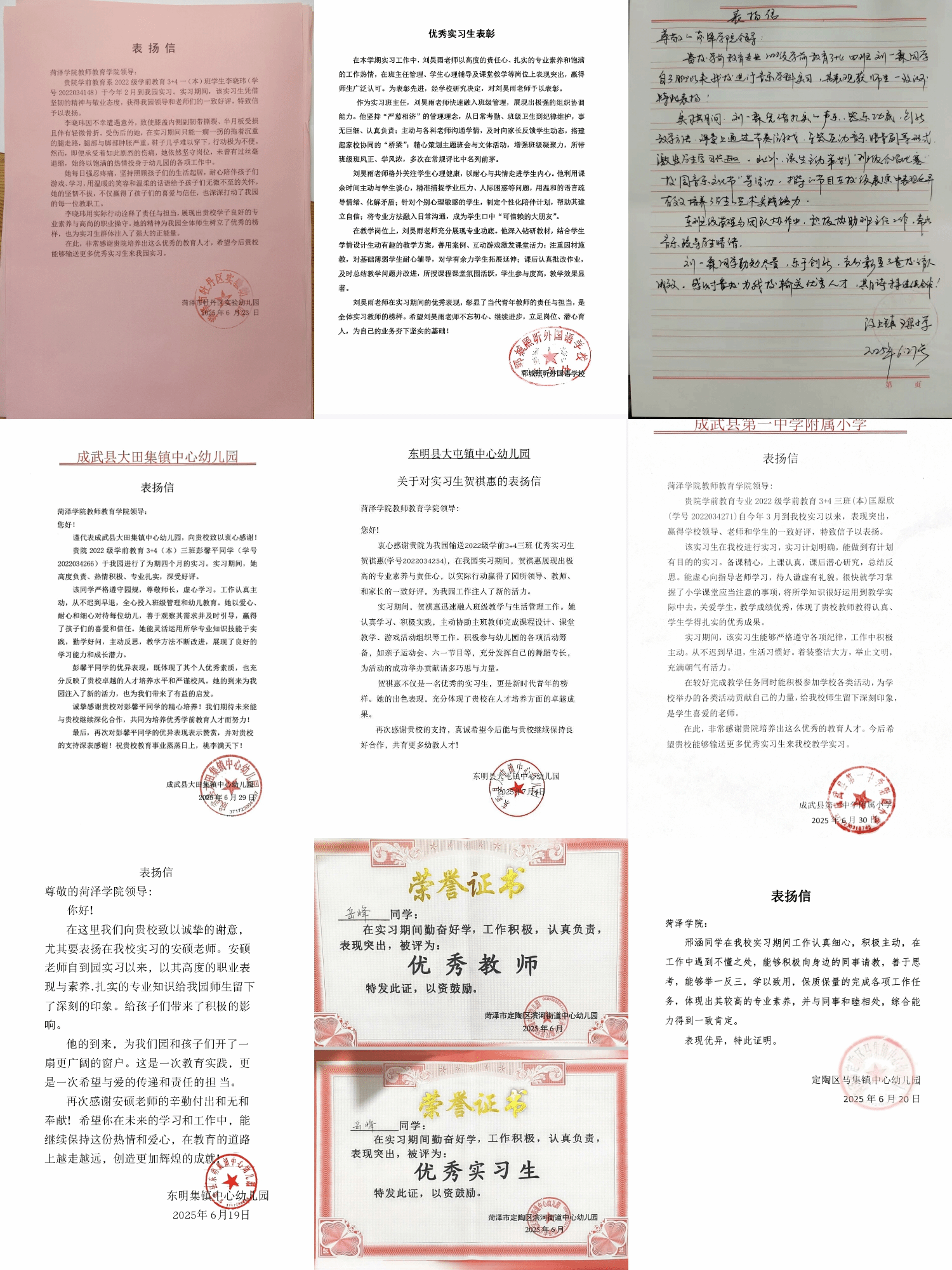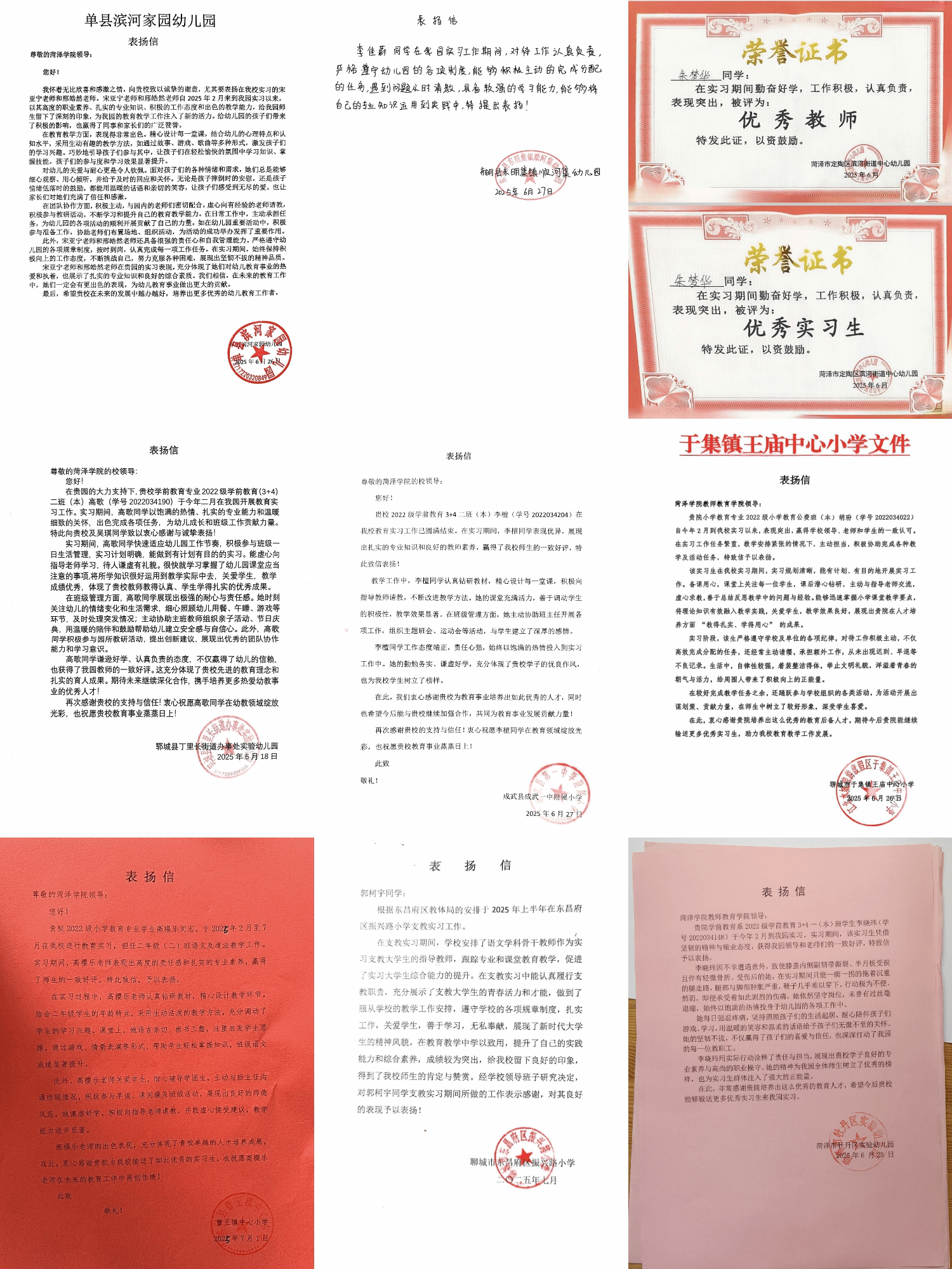 近日,教师教育学院收到了多所学校的实习生表扬信和优秀实习生奖状。信中分别对教师教育学院2025年上半年参加实习支教工作的任百玲、张茗哲、王宸、李晓玮等同学给予了高度赞扬。
