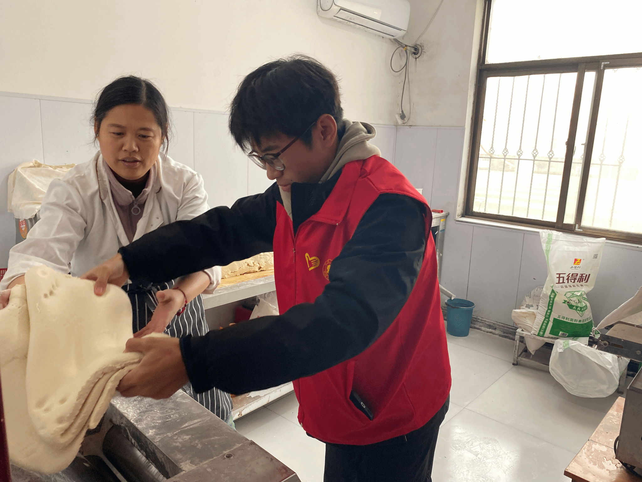 活动当天,志愿者们带着新鲜水果、牛奶等慰问品来到养老中心,先与工作人员对接,了解老人的身体状况与日常作息。随后,志愿者们分工协作,拿起抹布、拖把,仔细擦拭活动室的窗户玻璃,认真清扫走廊地面,将公共区域打理得整洁明亮,接着大家围坐在老人身边,耐心倾听他们分享生活趣事与人生故事,陪老人闲话家常。最后大家一起走进厨房,和工作人员一起准备馅料、擀面皮,与老人合作包起了饺子,大家分工有序、笑声不断,饺子的香气与温馨的氛围充满了整个养老中心。