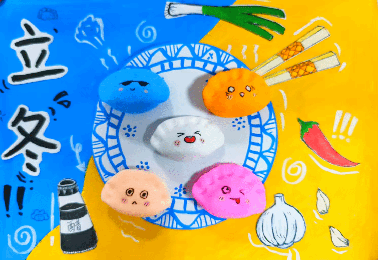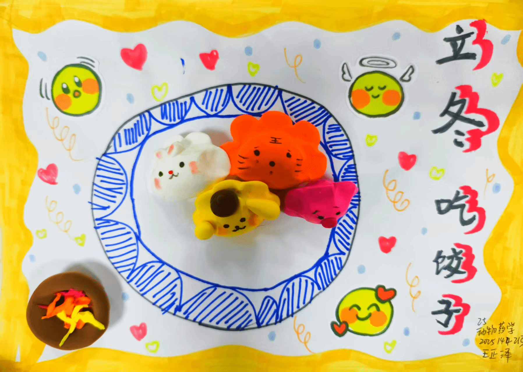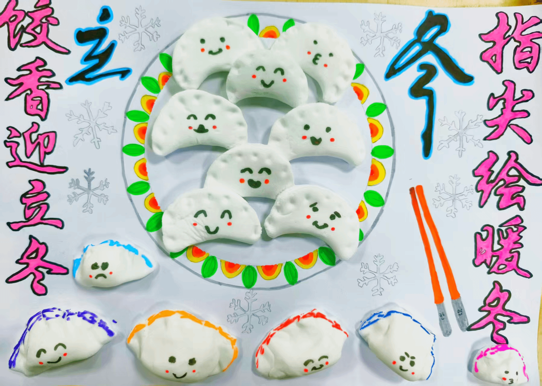 活动期间,同学们以立冬节气为核心展开创作:用卡纸绘制温馨背景,勾勒花纹精致的餐盘与飘着热气的桌布,点缀“立冬”字样与雪花元素;用超轻粘土捏制立体饺子,并赋予其微笑、眨眼等生动表情;以红、黄、橙等暖色调为主色,搭配饺子叶,营造出“餐桌围坐”的温暖氛围。作品融入“立冬吃饺子”的民俗内涵,将“家庭团聚”的传统内核与“校园温情”结合,让手工作品兼具观赏性与文化感。最终,李国宁、杨晨希等五位同学凭借新颖的创意构思与精致的制作工艺,荣获本次活动一等奖。