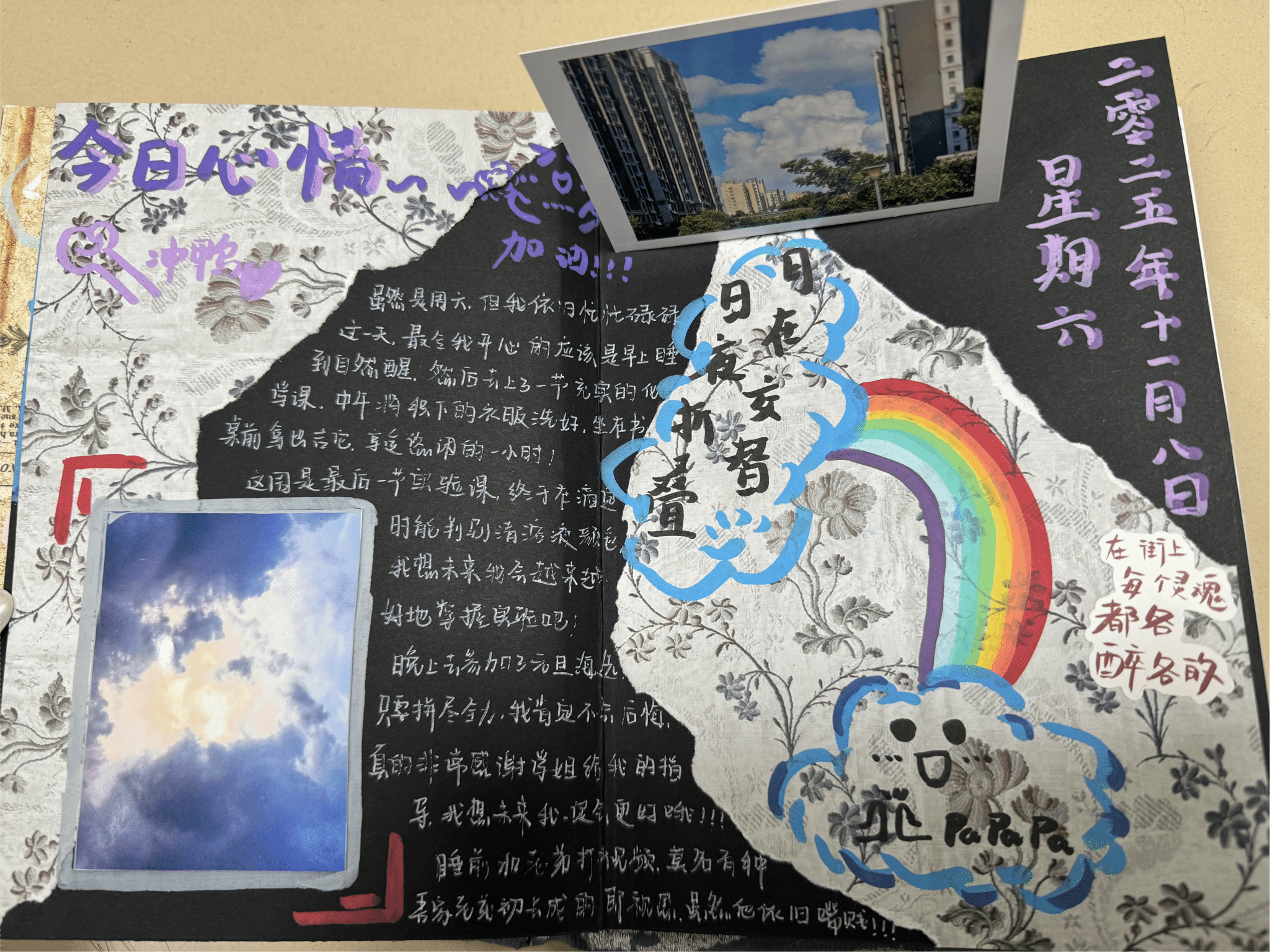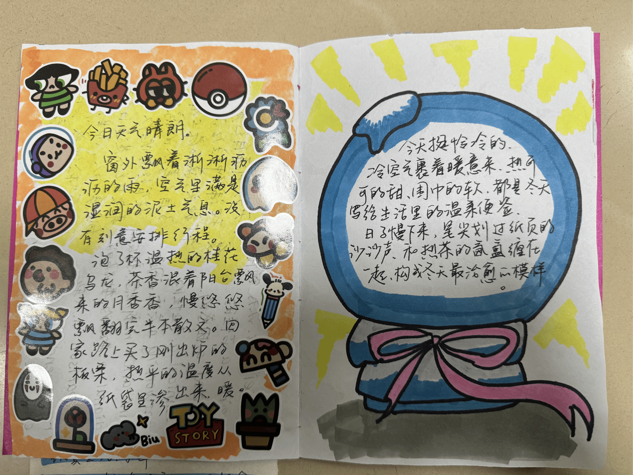 活动期间,同学们围绕“心理健康与自我成长”核心展开创作,通过文字沉淀了对个人特质与价值观的深度思索,在书写中完成自我发现。大家细致记录情绪起伏的瞬间与成因,逐渐习得情绪管理的方法,同时梳理学习生活的成长脉络,勾勒梦想目标的推进轨迹。创作中,同学们将文字与手绘插画、创意装饰巧妙结合,通过独特的排版设计与色彩搭配,让每一本手帐都成为独属于自己的心灵印记,既展现了丰富的想象力,也传递了积极向上的生活态度。最终,刘俪萱、古筝等五位同学以鲜明的主题表达、真挚的情感传递与出色的创作呈现脱颖而出,斩获本次活动一等奖。