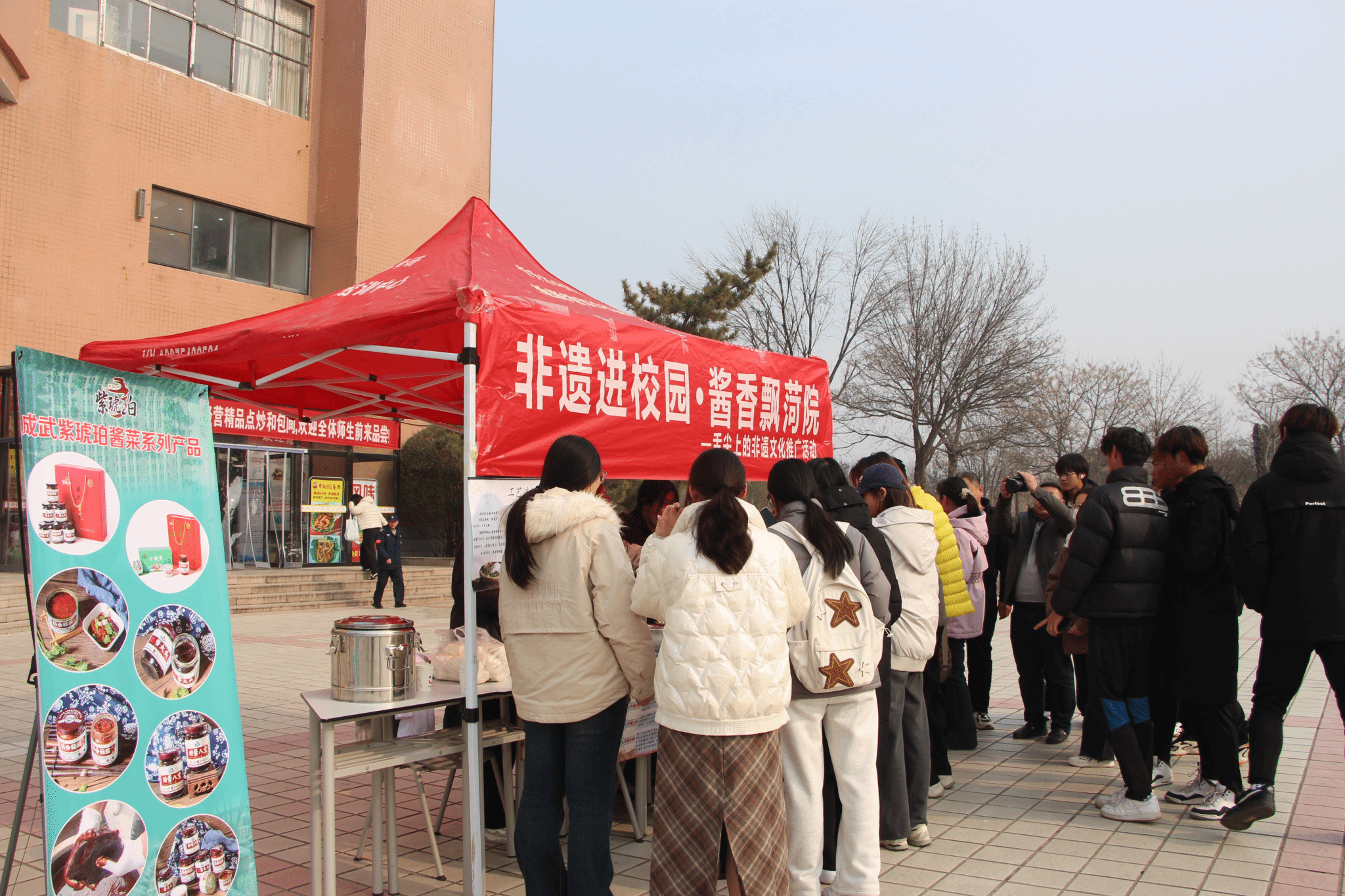 现场设置的“非遗文化讲解角”人气高涨,社团成员化身“非遗讲解员”,用通俗易懂的语言,向师生们细致介绍成武酱大头的制作流程、工艺特点以及蕴含的鲁西南饮食文化内涵,让大家对非遗文化有了更直观、更深刻的认知。