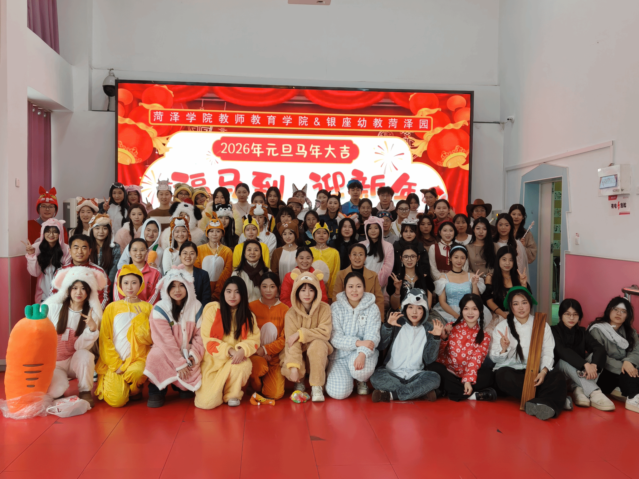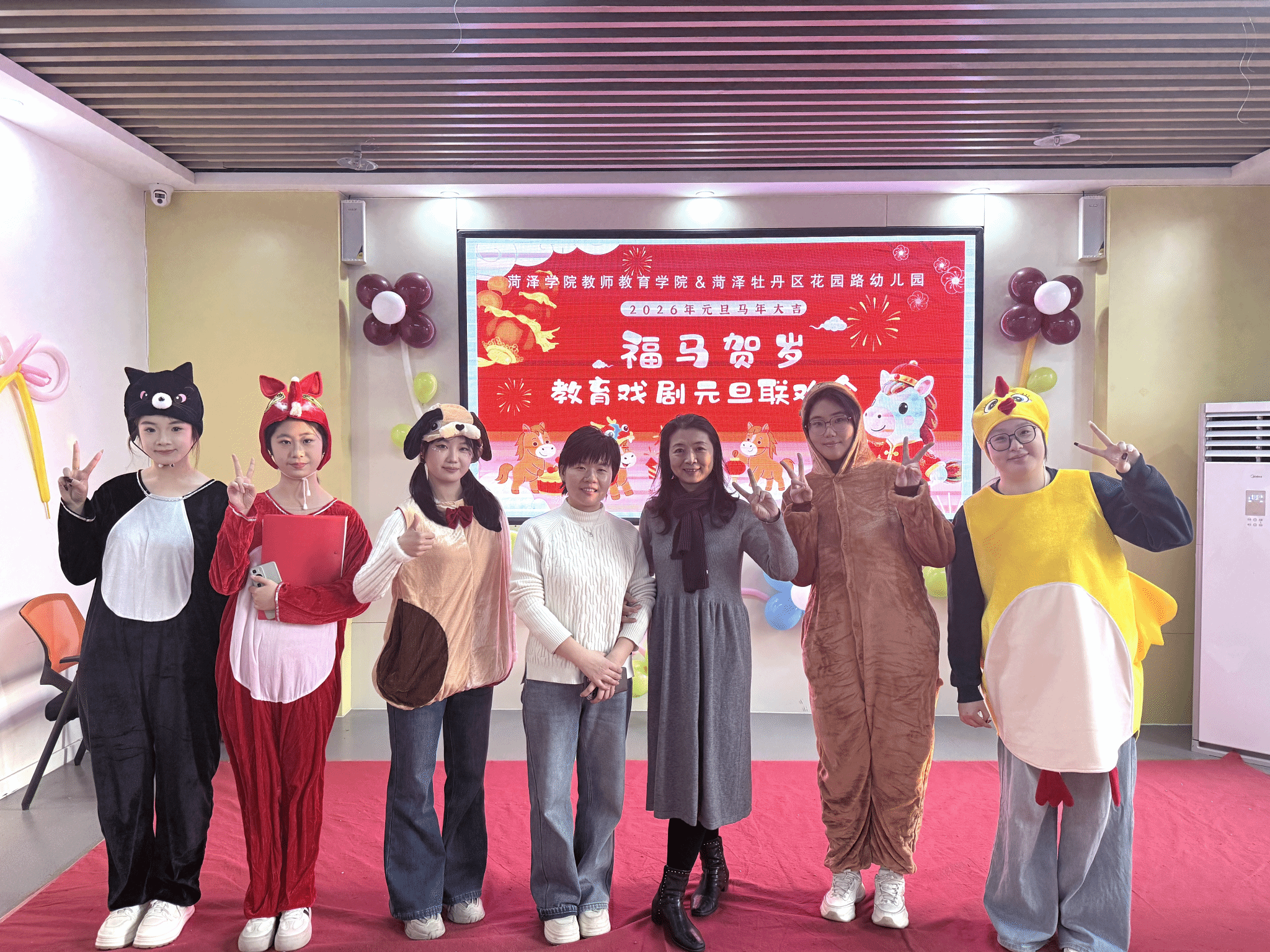 近日,元旦佳节来临前夕,教师教育学院2023级学前教育专业的学子在学前教育专业副主任陈德艳、学前儿童艺术教育教师刘雪芹带领下,走进牡丹区花园路幼儿园、银座幼教菏泽园,开展“福马到 迎新年”教育戏剧展演活动,以沉浸式戏剧表演为两所幼儿园的孩子们送上别样的新年祝福,用专业力量为幼儿成长添彩赋能。