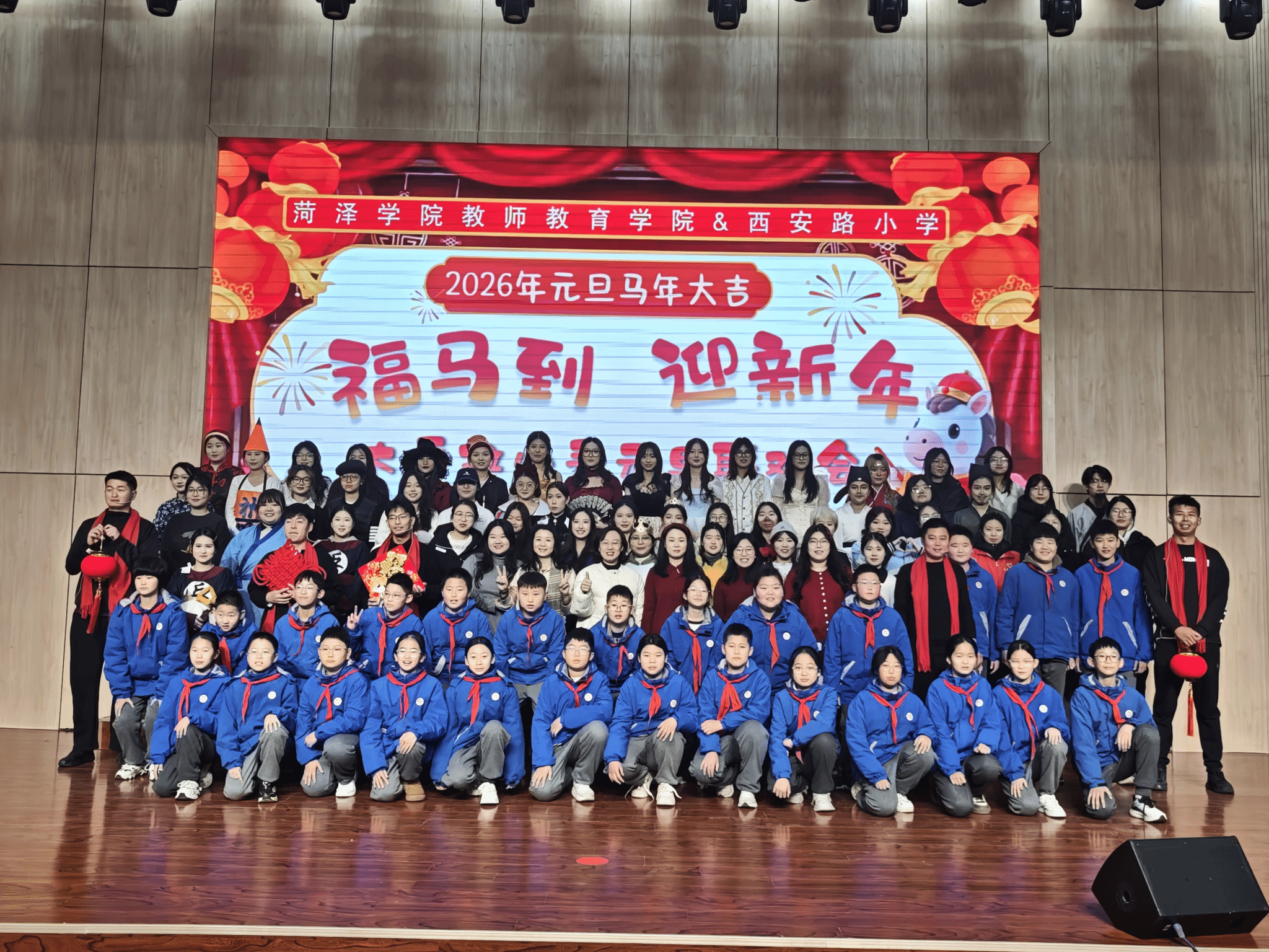 为喜迎2026年元旦,12月31日,教师教育学院与牡丹区西安路小学联合举办“大手牵小手,‘艺’起迎元旦”联欢活动。小学教育系党支部书记、系主任李靖、摘星戏剧工作坊指导老师刘雪芹带领摘星戏剧工作坊成员,与牡丹区西安路小学校长陈绪英及师生代表同台互动,为孩子们勾勒出一场满是艺术与欢乐的元旦记忆。