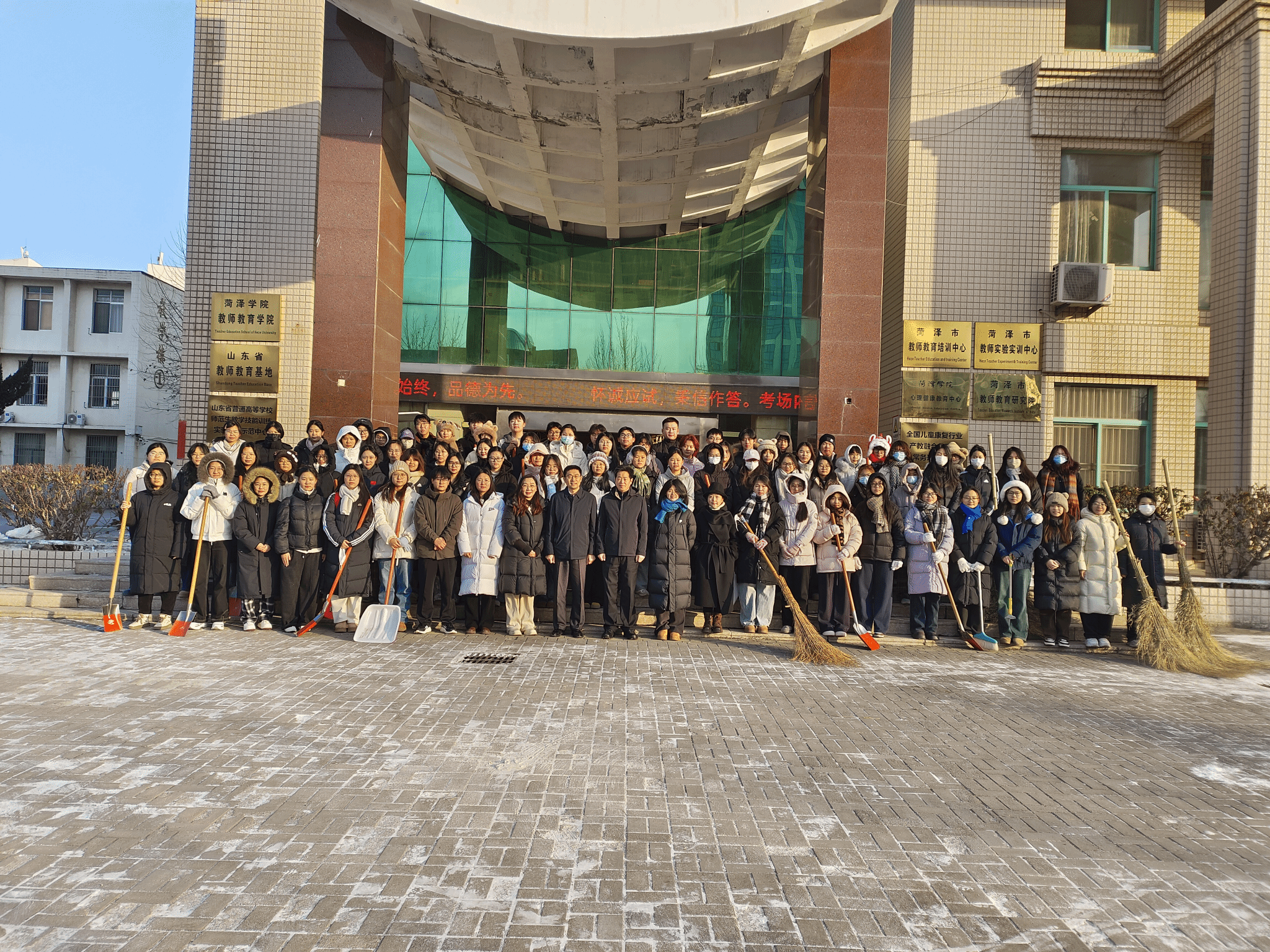 1月20日上午,教师教育学院组织学生党员、入党积极分子及学生干部在4号教学楼楼前开展扫雪除冰志愿服务活动,以实际行动保障校园安全、践行劳动精神。