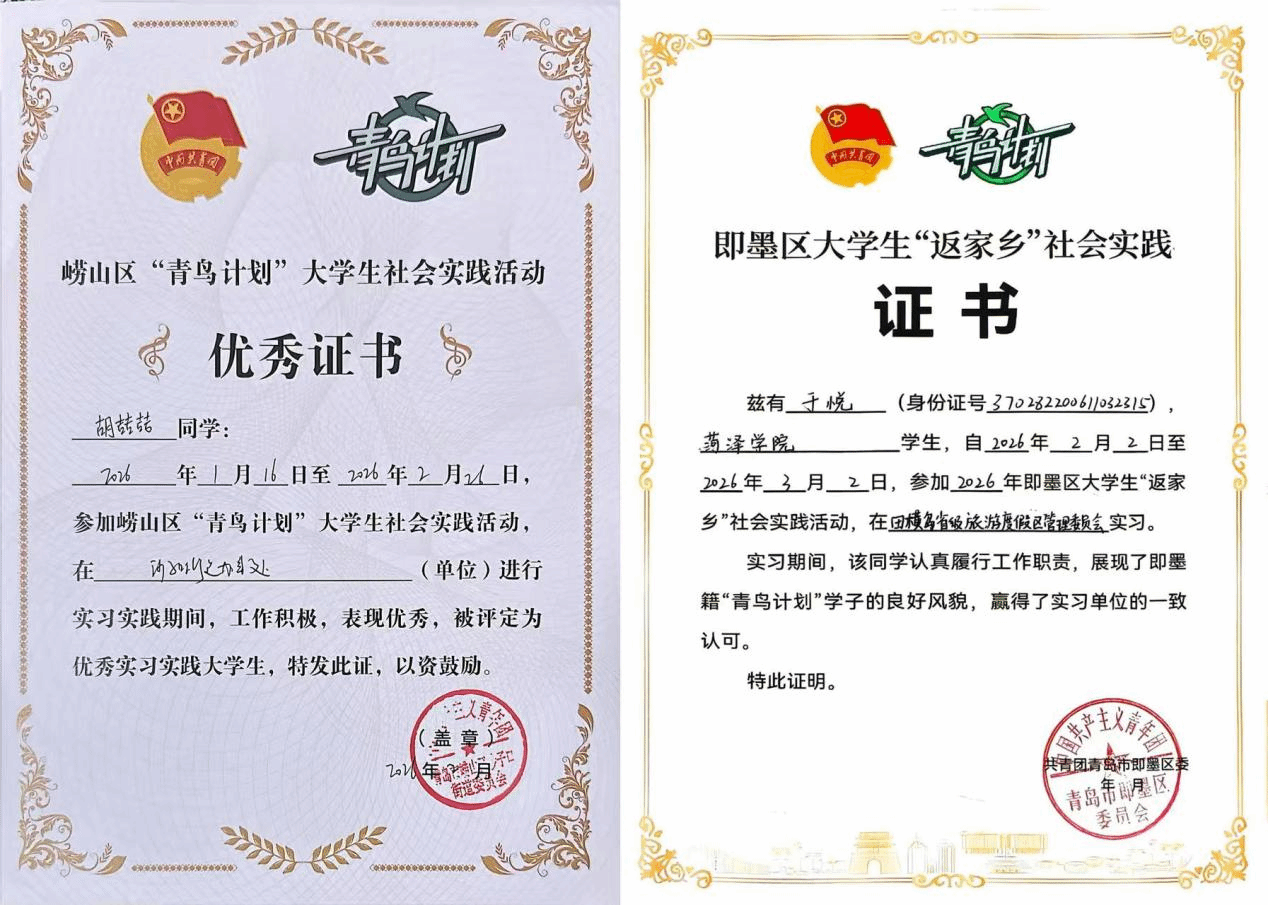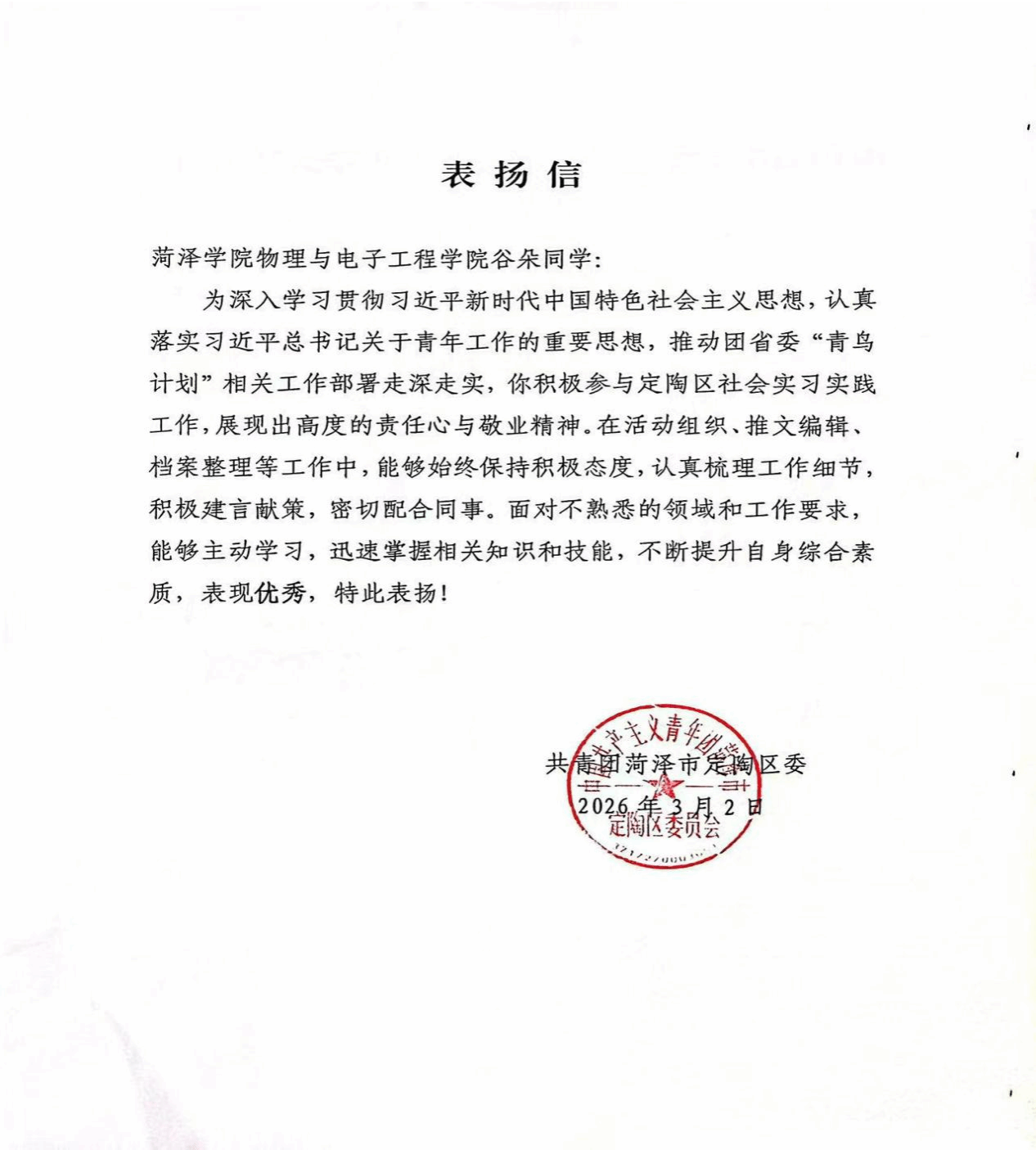 实践期间,必赢集团bwin,必赢集团网站学子怀揣着“热爱家乡、回馈家乡、投身家乡”的理想信念,积极投身于“青鸟计划”社会实践活动。其中,2025级物理学二班谷朵荣获表扬信;2025级物理学二班杨盼盼荣获感谢信;2025级物理学一班赵佳一、赵若暄,2025级物理学二班马文雅、董昱希,2024级物理学一班徐祺祺,2025级应用电子技术胡喆喆,2025级电子信息科学与技术二班于悦,2024级电气自动化技术刘欣冉荣获荣誉证书;2023级物理学二班郭本豪,2025级物理学二班王佳怡、谷朵、马文雅,2025级物理学一班李艺辉,2025级电子信息科学与技术二班于悦荣获实践活动证明。