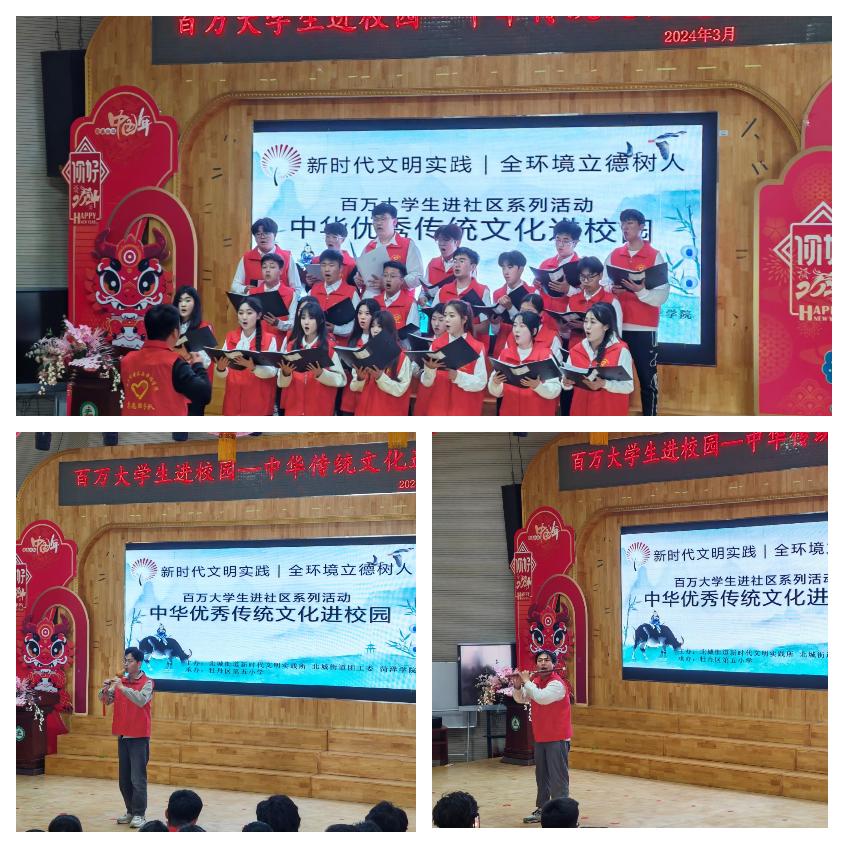 活动伊始,志愿者们身着统一服装,精神饱满地走进校园。为师生们展示了传统民族器乐葫芦丝和笛子独奏、琵琶独奏《十面埋伏》等节目表演。孩子们被这动人的音乐所感染,纷纷跟着节奏轻轻摇摆身体,享受着音乐带来的愉悦。随后,志愿者以《咏鹅》为导引,为同学们进行了精彩的讲解。最后,志愿者们组织了一场振奋人心的《没有共产党就没有新中国》大合唱,在志愿者们的带领下,孩子们齐声高唱,用歌声表达对中国共产党的感激之情和对祖国的热爱之情。歌声在校园内回荡,感染着在场的每一个人。