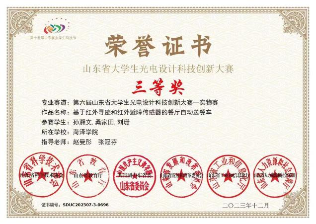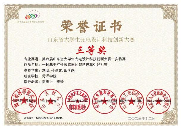 科技是国家强盛之基,创新是民族进步之魂。大学生电子科技创新社团会不定期组织内部选拔,选取出最优秀的团队代表社团参加各类比赛,与其他高校的优秀团队交流,展示大学生电子科技创新社团的创新能力和团队合作精神。不仅可以增强学生对科技创新的认知,还可以激发他们对科技前沿的兴趣,引导他们积极参与科技创新活动。在2023年8月,大学生电子科技创新社团在第六届山东省大学生光电设计科技创新大赛——实物赛荣获三等奖(二组),在大学生物理实验大赛中荣获三等奖(一组),获得了可喜的成绩,发挥了高校社团在科技创新中的重要作用。